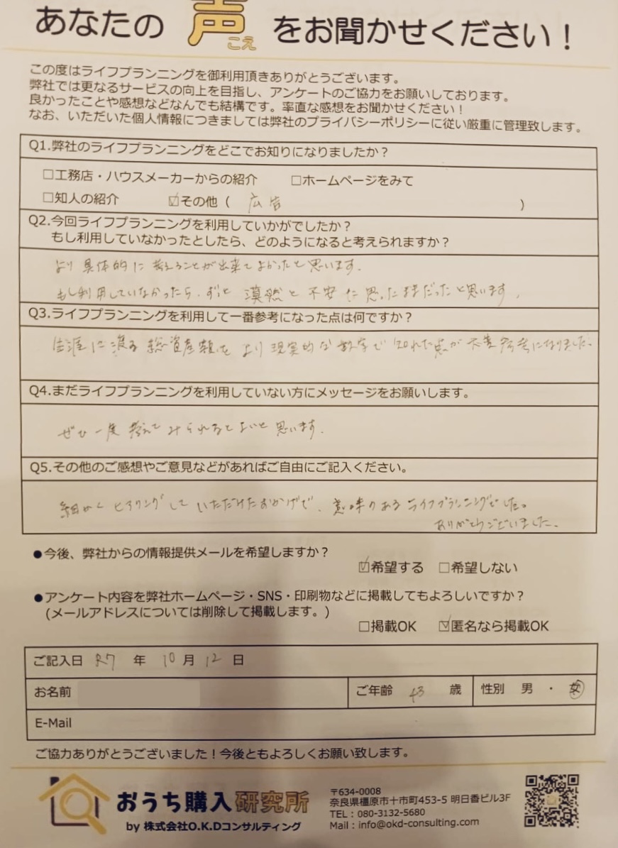 細かくヒアリングしていただけたおかげで、意味のあるライフプランニングでした。ありがとうございました。