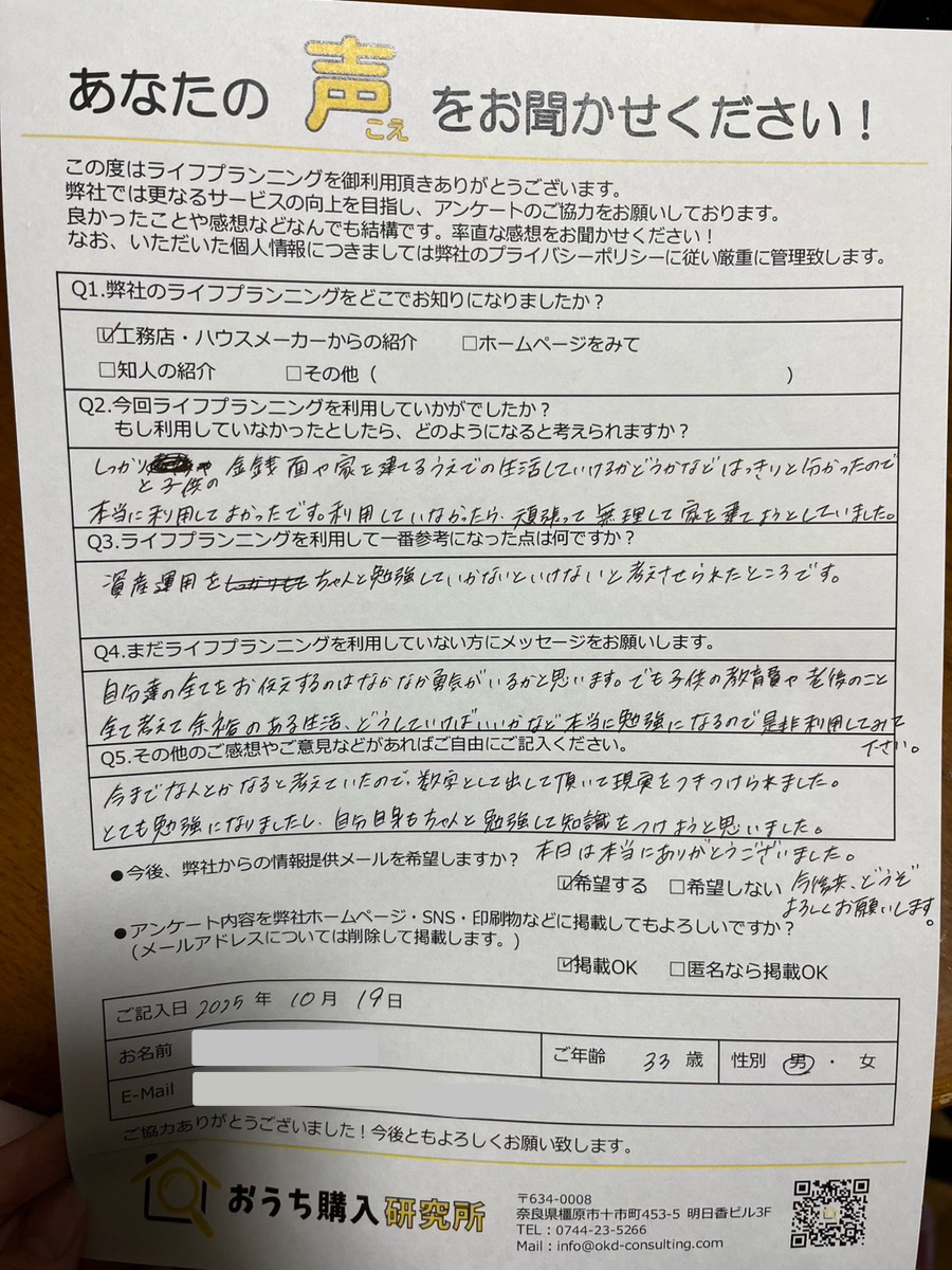 しっかりと子供の金銭面や家を建てるうえでの生活していけるかどうかなどはっきりと分かったので、本当に利用してよかったです。