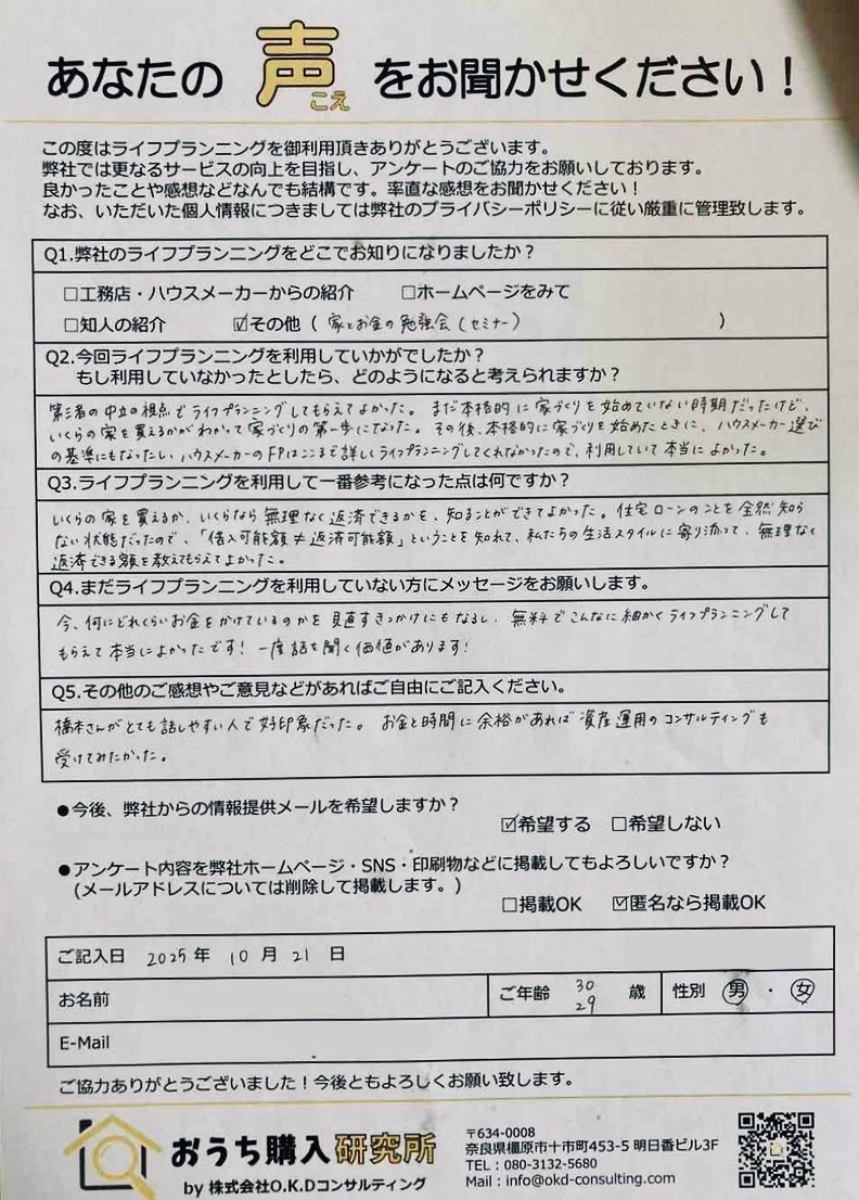 第三者の中立の視点でライフプランニングしてもらえてよかった。まだ本格的に家づくりを始めていない時期だったけど、いくらの家を買えるのかがわかって家づくりの第一歩になった。