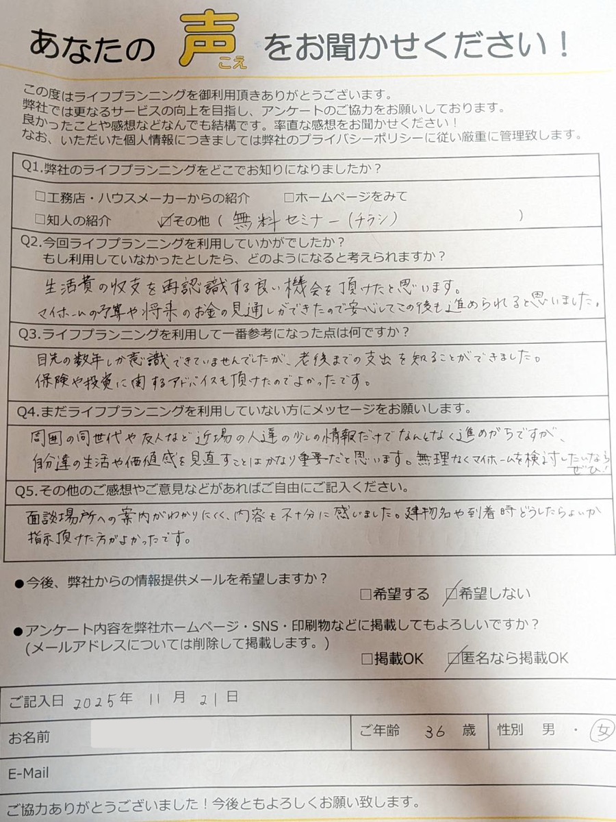 マイホームの予算や将来のお金の見通しができたので安心してこの後も進められると思いました。