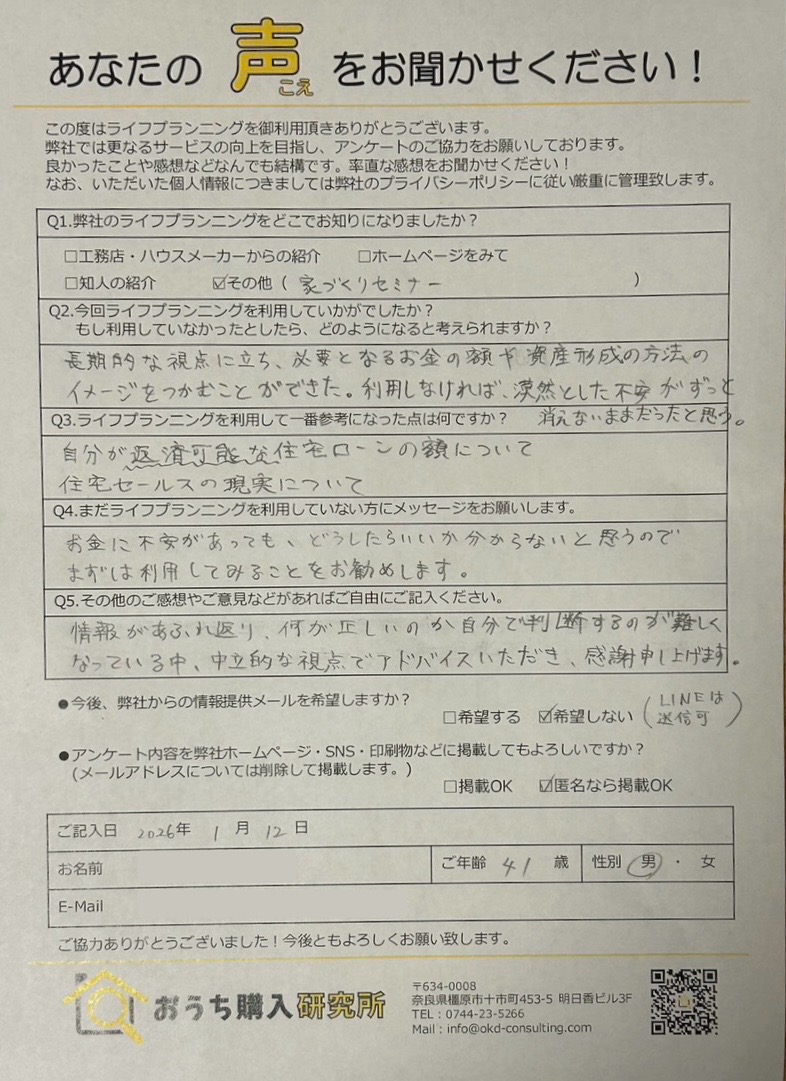 長期的な視点に立ち、必要となるお金の額や資産形成の方法のイメージをつかむことができた。利用しなければ、漠然とした不安がずっと消えないままだったと思う。