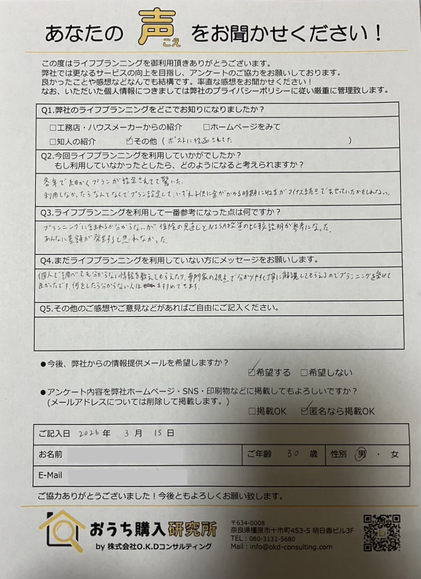 個人で調べても分からない情報を教えてもらえたり、専門家の視点で分かりやすく丁寧に解説してもらえるのでプランニングを受けて良かったです。何をしたら分からない人はおすすめできます。