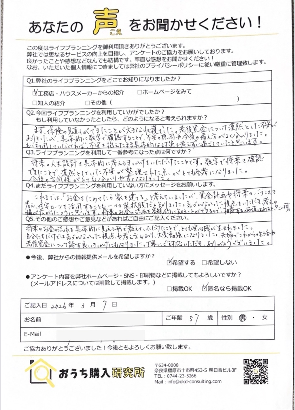 これまでは「お金をためてから家を建てる」と考えていましたが、資金計画や将来のバランスを考え、住宅ローンを活用することも一つの選択肢だと知りました。気づかなかった視点をいただき、考えの幅が広がったように思います。将来のお金の流れを客観的に知ることができるので相談する価値はあると思います。