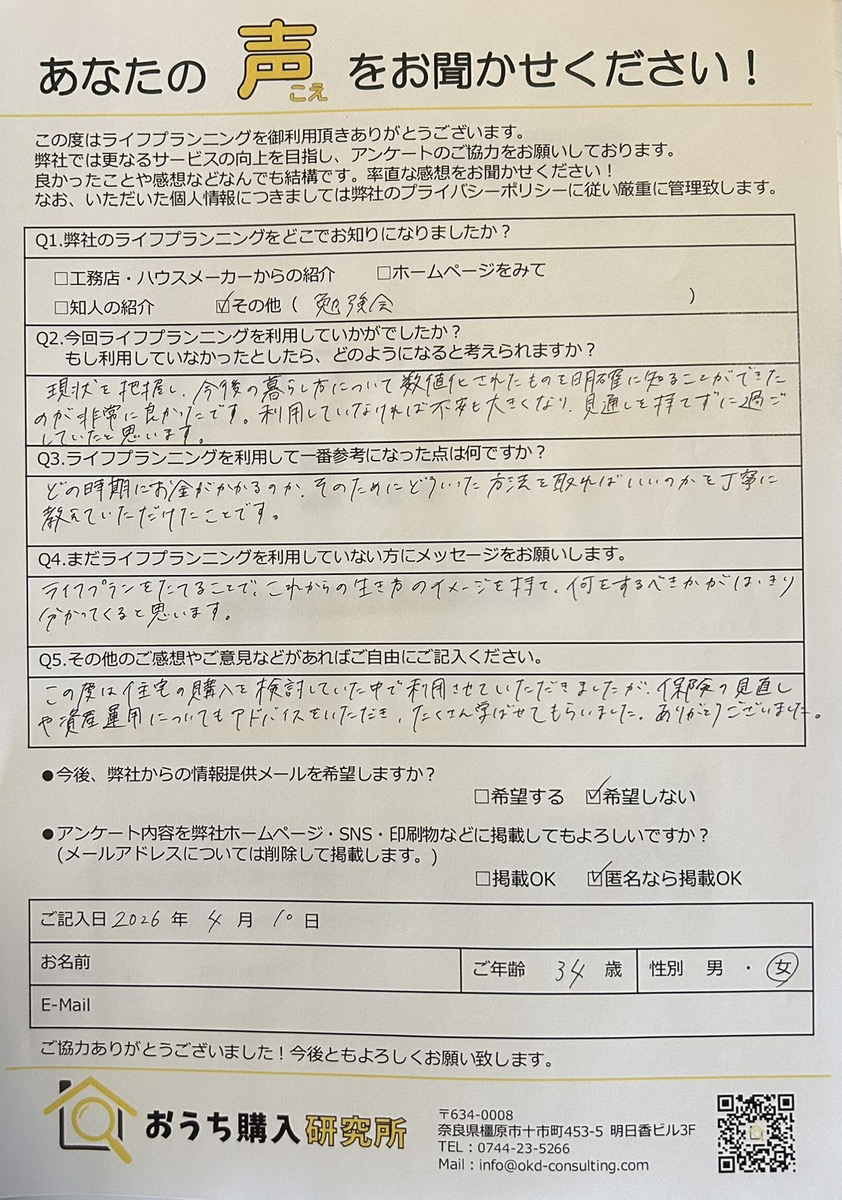この度は住宅の購入を検討していた中で利用させていただきましたが、保険の見直しや資産運用についてもアドバイスをいただき、たくさん学ばせてもらいました。ありがとうございました。